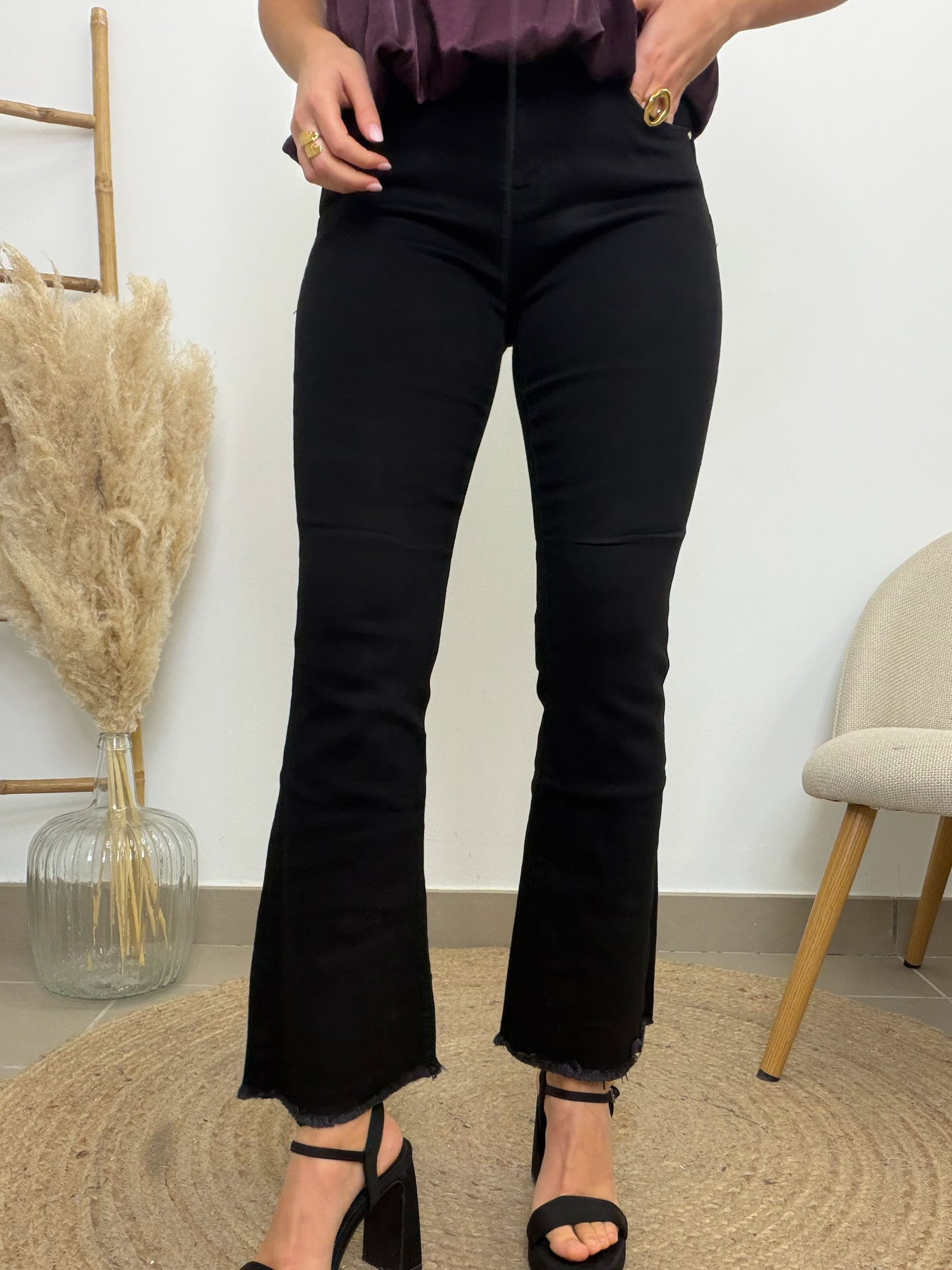 En color negro y con cintura alta, este vaquero estilo cropped tiene ese aire diferente que hace que cualquier look destaque. Su acabado acampanado y deshilachado le da un toque moderno y relajado, mientras el largo al tobilloestiliza y deja lucir el calzado.