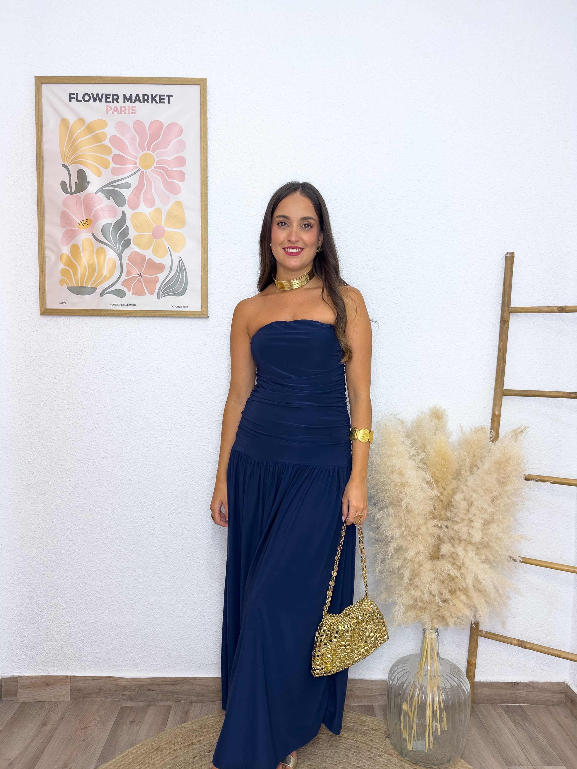 Sofisticado y lleno de carácter, este vestido elástico en tono azul oscuro abraza la silueta con elegancia y estilo.