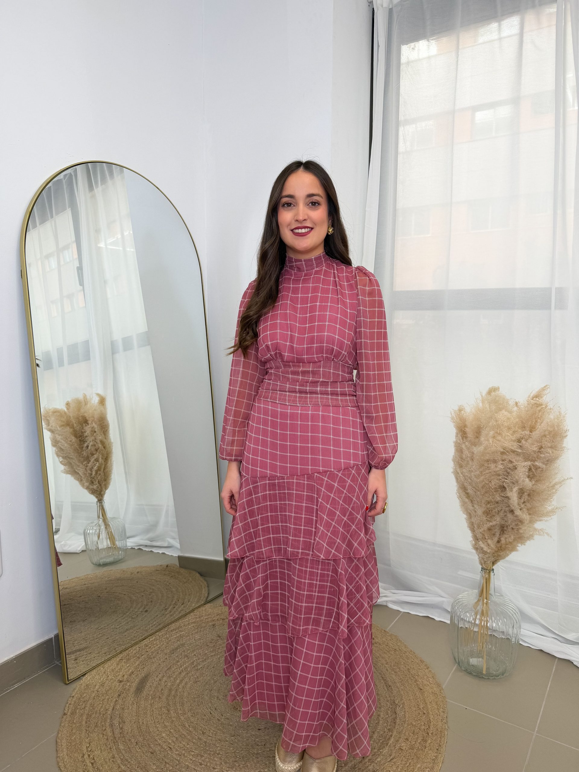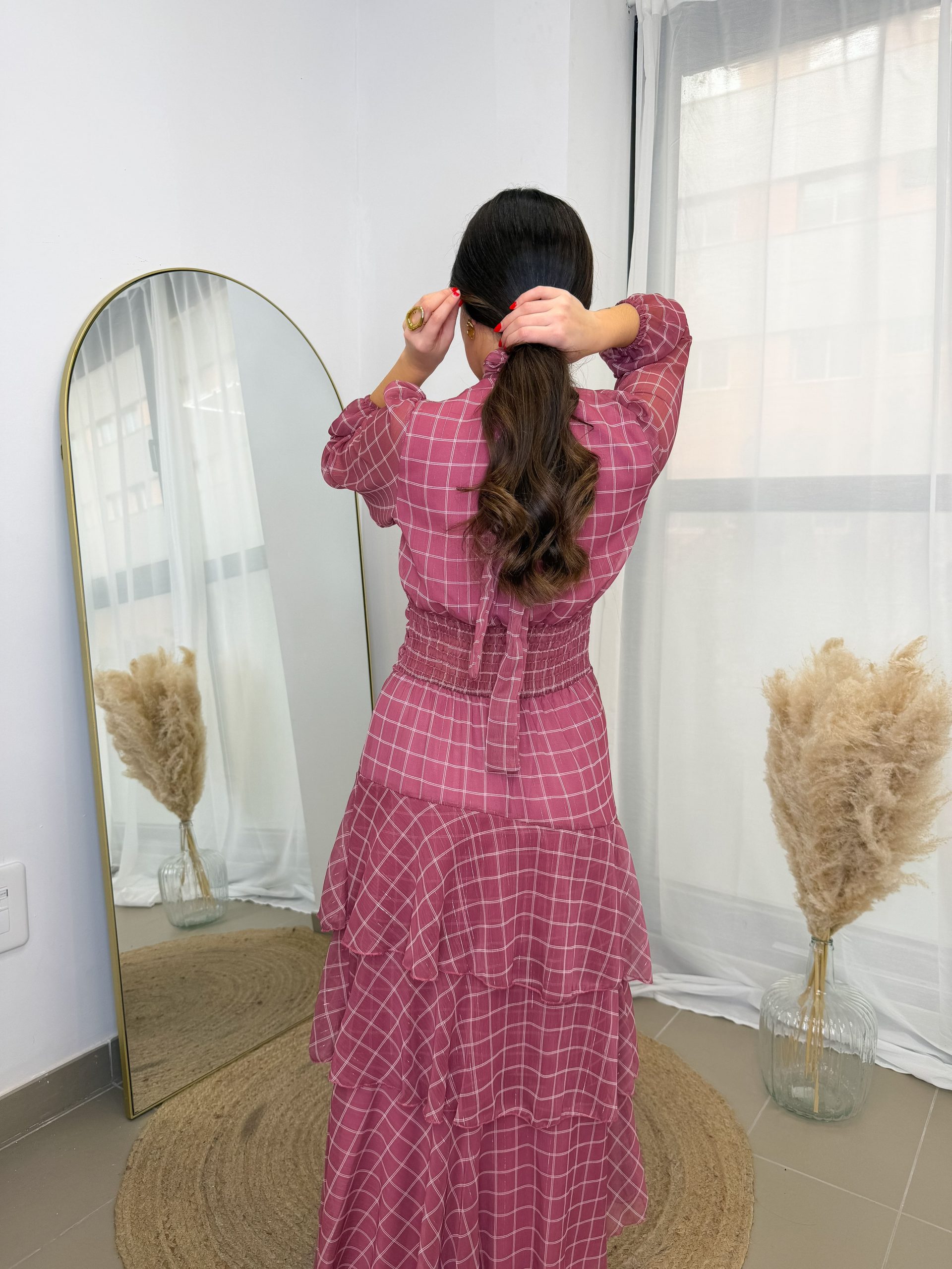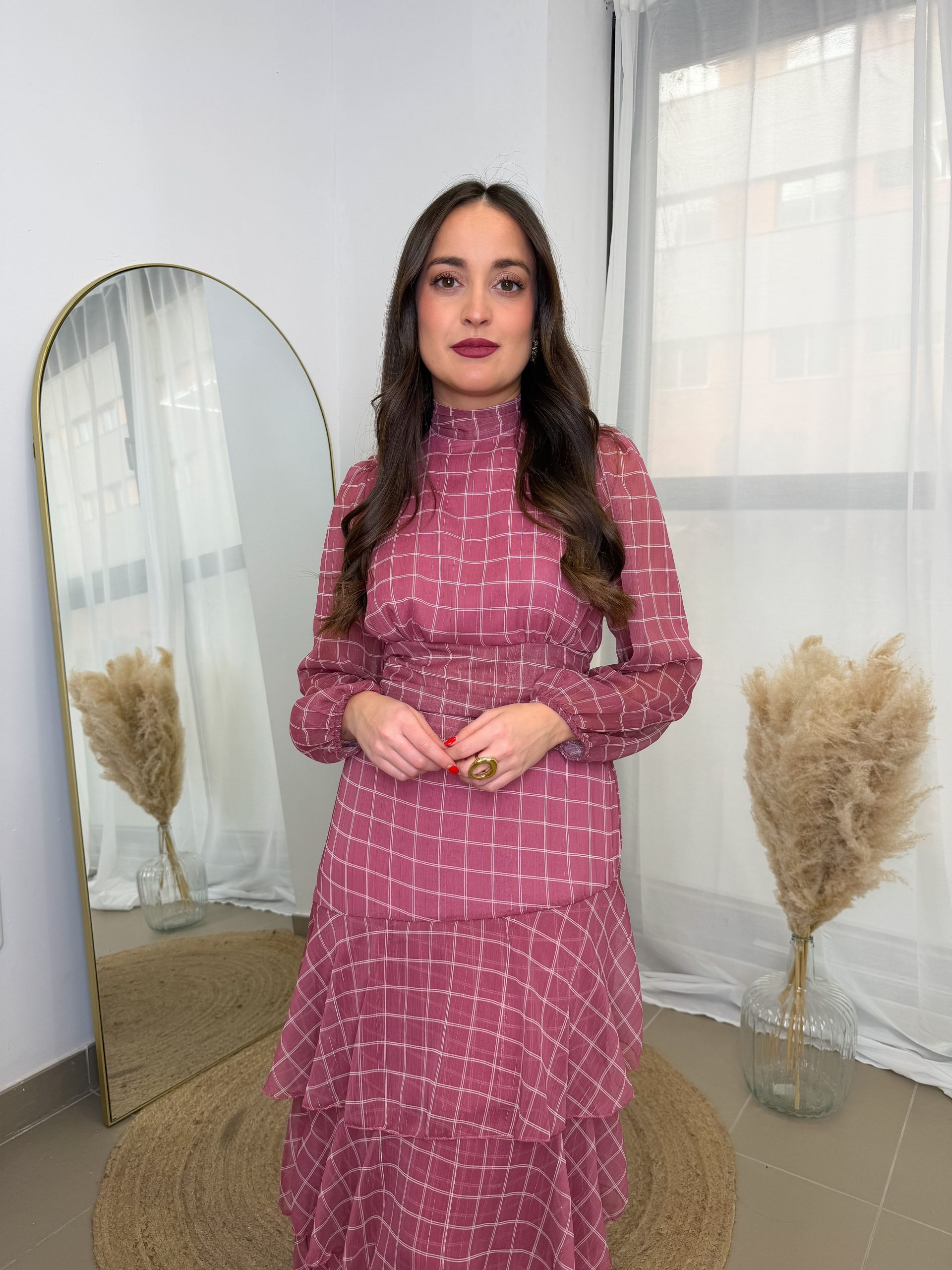El cuello un poquito subido aporta ese toque elegante que equilibra a la perfección. Las mangas terminan con una gomilla en la muñeca, cómodas y delicadas. El fajín en la cintura ayuda a definir la silueta sin apretar, y la falda con sus tres volantes aporta movimiento, feminidad y ese “algo” que hace que el vestido tenga vida propia.